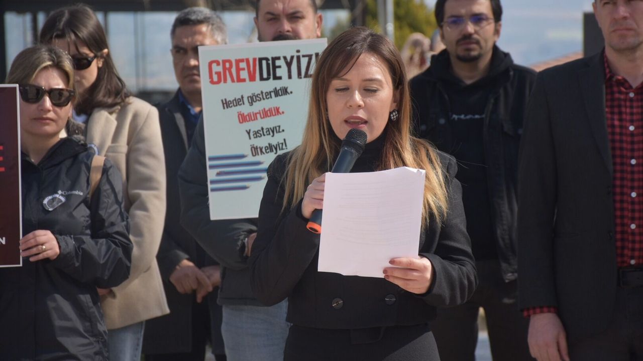 Aydın’ın Karacasu ilçesinde, öğretmen Fatma Nur Çelik’in bir öğrenci tarafından saldırıya uğrayarak hayatını kaybetmesi üzerine Eğitim ve Bilim İşgörenleri Sendikası (Eğitim-İş) üyesi öğretmenler basın açıklaması düzenledi.