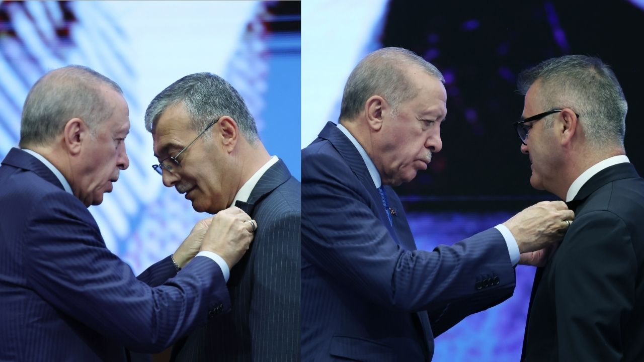 Paylaşılan fotoğraflarda, Cumhurbaşkanı ve AKP Genel Başkanı Recep Tayyip Erdoğan'ın, iki belediye başkanına parti rozetlerini taktığı görüldü.