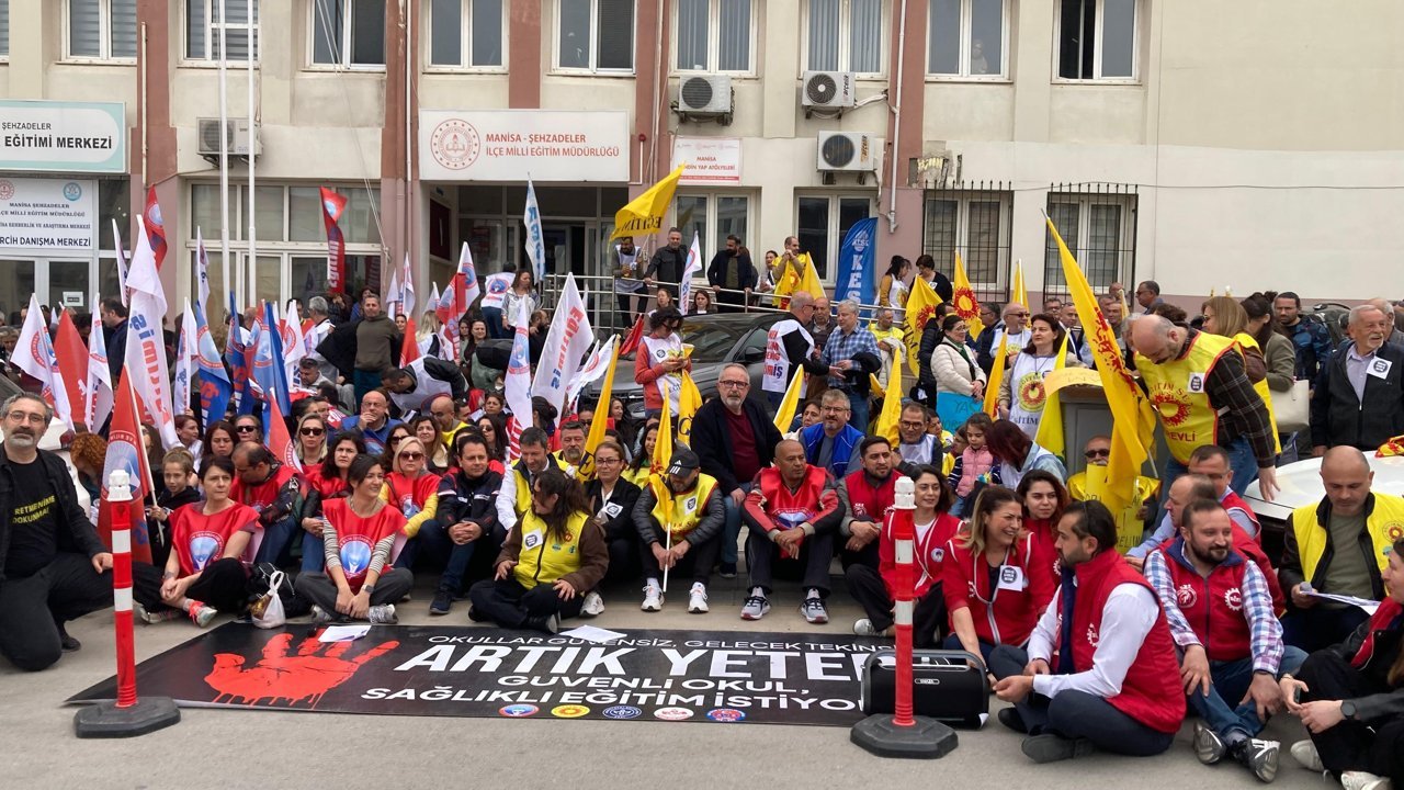 Manisa’da Eğitim-Sen ve Eğitim-İş öncülüğünde iki gün boyunca iş bırakma eylemi ile başlayan tepki eylemleri, Şehzadeler İlçe Milli Eğitim Müdürlüğü önünde basın açıklaması ve ardından oturma eylemiyle devam etti.