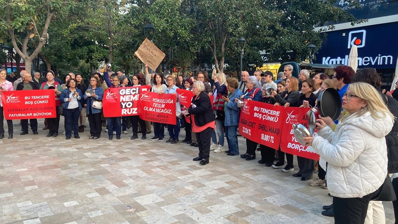 Manisalı kadınlar, CHP İl Kadın Kolları Başkanı Gülbahar Tahmilci öncülüğünde Manolya 8 Eylül 15 Temmuz Demokrasi Meydanı’nda ellerinde boş tencerelerle hükûmete seslendi.