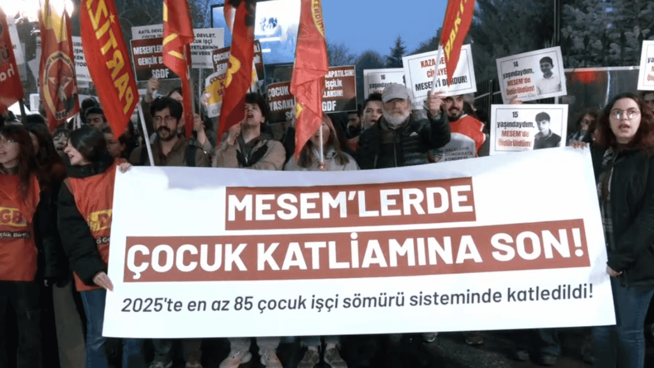 Ankara’da Milli Eğitim Bakanlığı (MEB) binası önünde bir araya gelen eylemciler, MESEM sistemi kapsamında çalıştırılan çocukların iş cinayetlerine kurban gittiğini belirterek hükümete tepki gösterdi. "MESEM'lerde çocuk katliamına son, 2025'te en az 85 çocuk işçi sömürü sisteminde katledildi" yazılı pankart açan grup, sık sık "Katledilen çocuklar isyanımızdır" ve "Kaza değil cinayet, kader değil katliam" sloganları attı. Grup adına okunan basın açıklamasında, 2025 yılı içerisinde 91 çocuğun çalışırken hayatını kaybettiği bilgisi paylaşıldı. Özellikle Dilovası’ndaki bir fabrikada yanarak can veren işçilerden ikisinin çocuk olduğu ve son olarak 16 yaşındaki MESEM öğrencisi Alperen’in çalıştığı fabrikanın üçüncü katından düşerek yaşamını yitirdiği hatırlatıldı. Açıklamada, bu ölümlerin münferit vakalar olmadığı, MESEM projesiyle öğrencilerin ucuz iş gücü olarak görüldüğü, güvencesiz ve iş güvenliğinden yoksun koşullarda çalıştırıldığı ifade edildi.