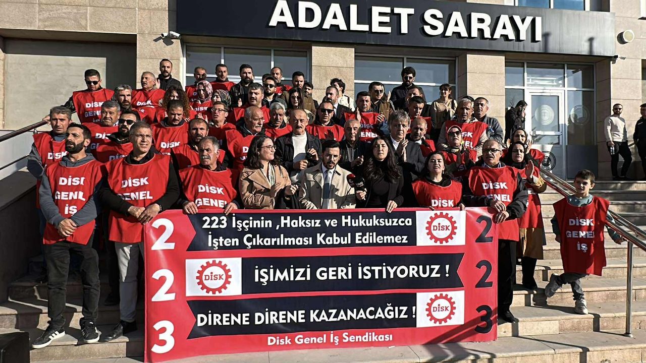 Özgürlükçü Hukukçular Derneği (ÖHD) üyeleri, Van Büyükşehir Belediyesi'nden kayyum yönetimi tarafından işten çıkarılan 223 işçiye destek amacıyla adliye önünde basın açıklaması düzenledi. Açıklamada, işçilerin tüm haklarıyla birlikte işe iade edilmeleri talep edildi.