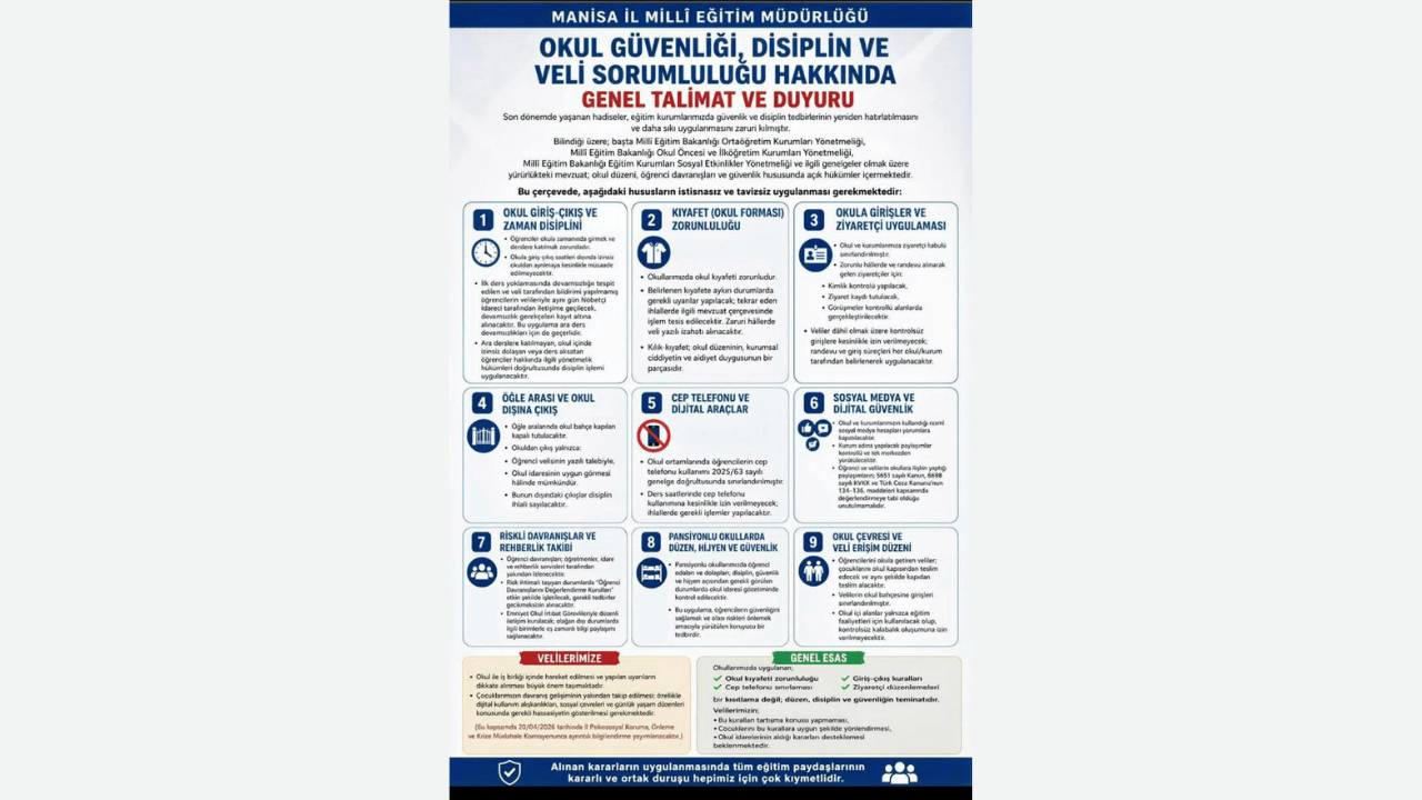 Manisa İl Millî Eğitim Müdürlüğü, yürürlükteki Millî Eğitim Bakanlığı Ortaöğretim Kurumları Yönetmeliği, İlköğretim Kurumları Yönetmeliği ve ilgili genelgeler doğrultusunda bir talimat yayımladı.