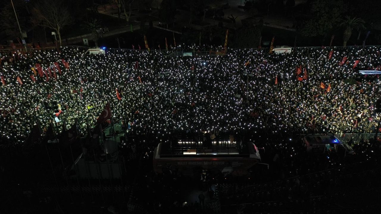 “Değerli İstanbullular, 19 Mart, devlet ve millet arasındaki sözleşmeyi yırtma girişimidir. 19 Mart, bu ülkeyi kim yöneteceğine millet karar vermesin diye yapılmıştır. Millet vergisini versin, askere gitsin, trafik cezası ödesin ama kendi iradesiyle iktidarı değiştiremezsin diye yapılmıştır. Bizim, sizin bir yıldır verdiğimiz mücadele bir mevzi olarak parti mücadelesi değildir. Bir cephe olarak demokrasi mücadelesidir. Bunun önemini, kıymetini kısaca şöyle hatırlatabiliriz. Biz demokratlar sandığın önemini biliyoruz. Geçtiğimiz haftalarda AK Parti İçişleri Bakanlığı bir düzenleme yaptı ve modifiye araçlara ceza kesen yeni bir uygulamaya geçti. Toplumdan beklenmedik bir tepki yükseldi. Ve bugüne kadar oyunu Cumhur İttifakı’na veren, AK Parti’ye veren, belki bizim bu mücadelelerimizi denk geldiğinde ‘Ne yapıyor bunlar?’ diyenler sosyal medyadan AK Parti’ye karşı ‘Sandıkta görüşürüz’ yazmaya başladılar. İşte 19 Mart milletin, ‘Sandıkta görüşürüz’ deme iradesine karşı, yani ister AK Parti’ye oy veren, sanayi sitesinde çalışan, bütün hayali aracını birazcık daha kendi hoşuna giden şekle sokmaya çalışan, aracının iki katı cezayı görünce sandıkta hesaplaşma isteyen olsun, ister İstanbul Üniversitesi’nin önünde toplanan, geleceğine sahip çıkan gençler olsun. Milletin egemen olduğu, milletin tek söz sahibi olduğu, tek adamların değil seçilmişlerin yönettiği, milletin istediğini başa getirdiği istemediğini gönderdiği bir düzen; bu ülkeyi var eden, kurtaran, kuran, bugünlere taşıyan düzendir. Bunun için sandığı ortadan kaldırmak isteyenlere, bir avuç darbeci kendisine göre bir düzen kurarsa bir daha kimsenin yüzüne bakmak istemeyen bu düzenbazlara karşı bu mücadeleyi, siyaseti ve sandığı koruma mücadelesini toplumsallaştırıyoruz. İşte sanayi sitelerine yayılan, işte köylerde tarlalarda konuşulan, işte işçi servislerinde gündeme gelen ‘Kardeşim hakkımı yiyorlar, hakkımı alırım. Almazsam karşı çıkarım. İstemediğimi değiştiririm’ diyen bu anlayış, bu darbeyi püskürtmek için en önemli güvencemizdir. Bu meydan sadece kendinden değil, bu mücadeleyi büyütmekten de mesuldür. Bu mücadeleyi büyütmeye, adım adım büyütmeye hep birlikte iktidara yürümeye hazır mıyız? Hazır mıyız?”