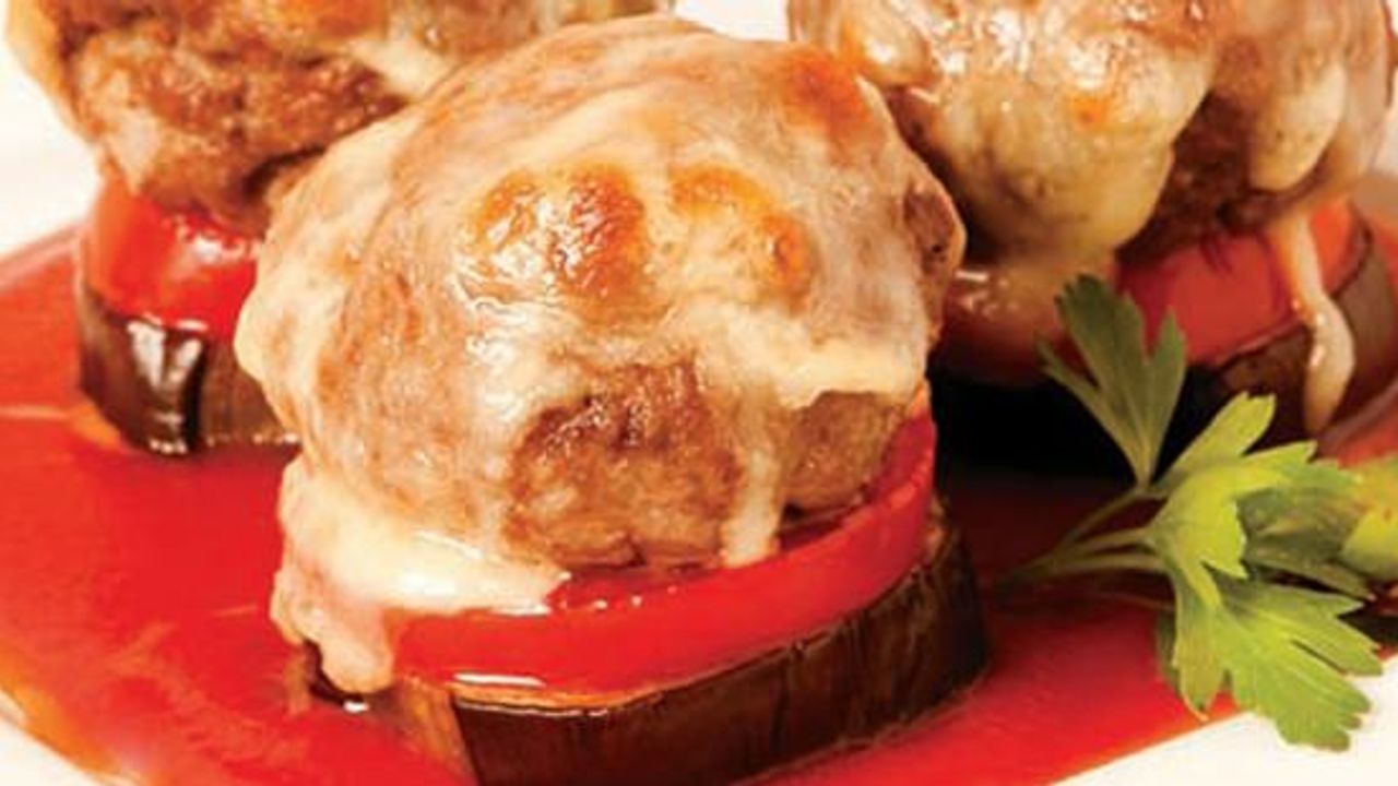 - Sırasıyla, 1 dilim patlıcan, 1 köfte, 1 dilim domates yerleştirin.