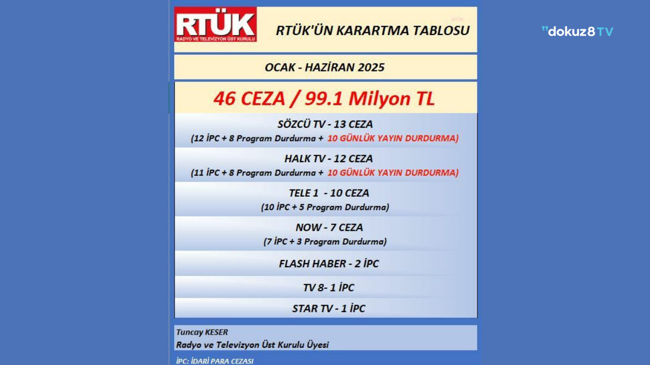 RTÜK üyesi Tuncay Keser, sosyal medya hesabından, RTÜK’ün yılın ilk 6 ayında verdiği cezalara ilişkin hazırladığı tabloyu paylaştı. Keser, şunları kaydetti: