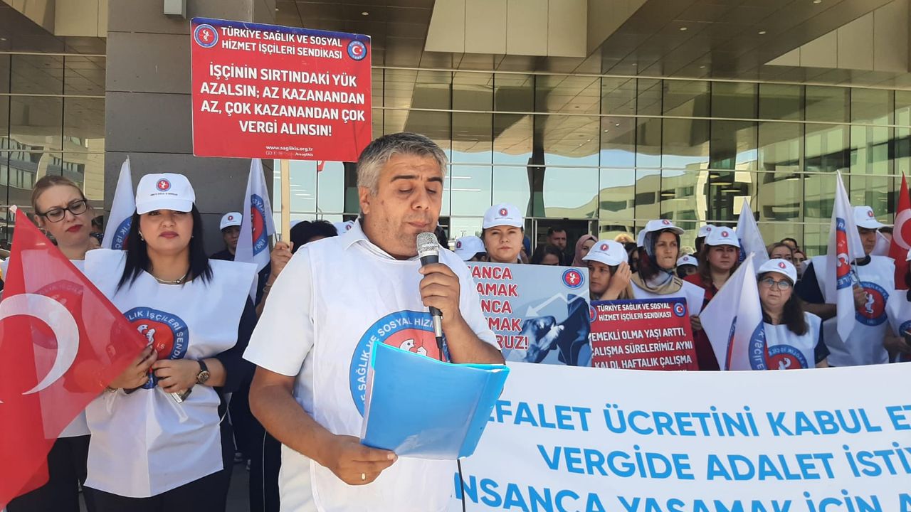 Öğle molasında gerçekleşen eyleme, Türk iş konfederasyonuna bağlı Sağlık İş'in İzmir şube yönetimi, Manisa il temsilcileri, işyeri temsilcileri ve işçiler yoğun katılım sağladı. Basın açıklaması öncesinde işçilere seslenen Sağlık İş İzmir Şube Başkanı Özgür Arslan, “Bize, siz açlık sınırı seviyesinde, düşük ücretle çalışacaksınız, biz size ne verirsek onu kabul edeceksiniz, diyorlar. Biz, düzenli olarak vergimizi veren emekçileriz. Biz bunu kabul etmiyoruz.” diyerek sözlerine başladı. Arslan ayrıca, “Biz sefalet ücreti istemiyoruz. İnsanca çalışma, insanca yaşam koşulları sağlansın diye mücadele veriyoruz. Bizim mücadelemiz sadece kendi mücadelemiz değil. Bu ülkede yaşayan köylünün de mücadelesi, emeklinin de mücadelesi, asgari ücretle çalışanın da mücadelesi. Hepimizin evinde asgari ücretle çalışan var. Anne babalarımız emekli. Ev kiraları almış başını gidiyor.” dedi ve “Enflasyonun yükselmesinin sebebi emekçiler değildir. Büyük sermaye gruplarının vergilerini affediyorlar. Bize de diyorlar ki, işçi maaşlarını yükseltirsek enflasyon da yükselir. Biz bunu kabul etmiyoruz.” vurgusunu yaptı.