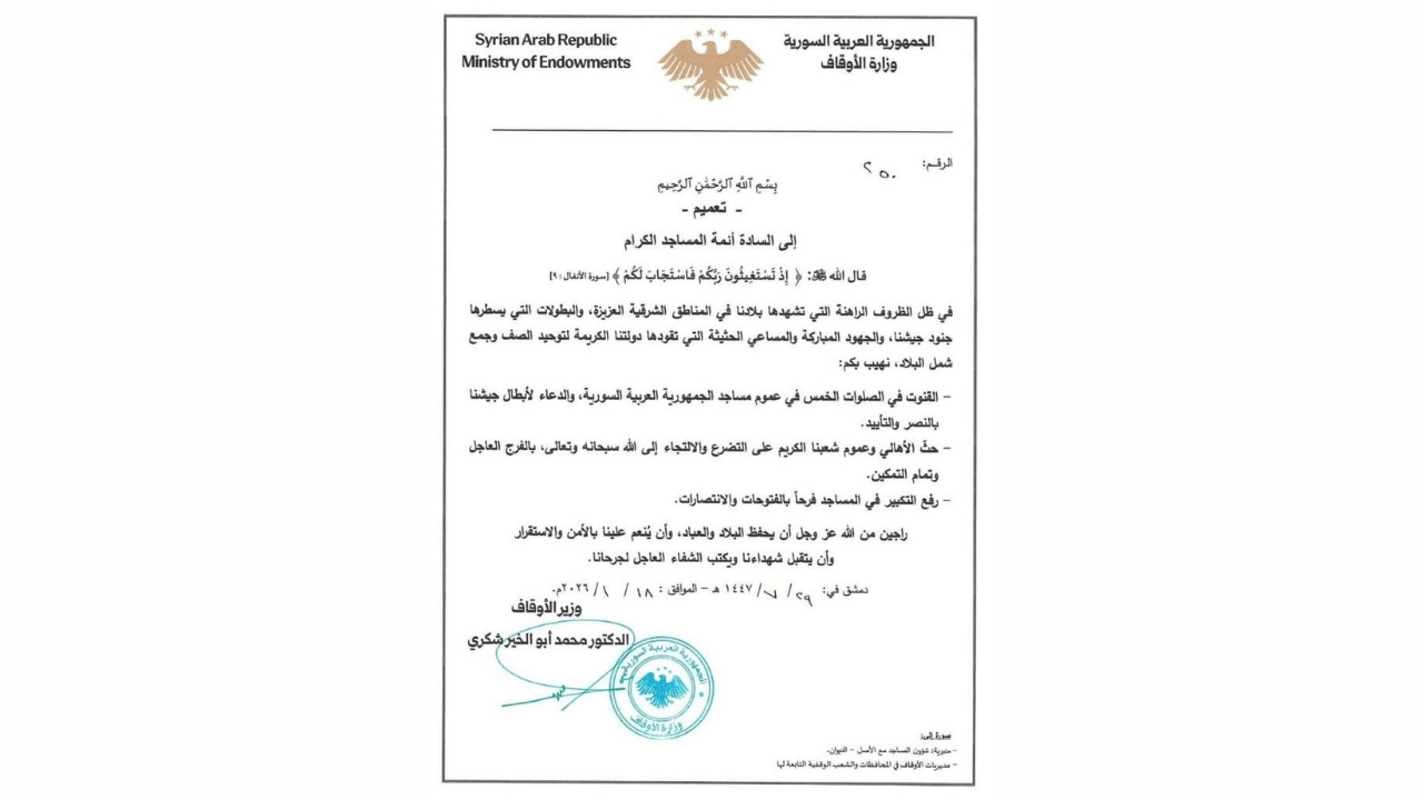 Bakanlık, hatiplerden 5 vakit farz namazda, Şam’a bağlı grupların “zaferi” için “Kunut” duası okumalarını istedi.