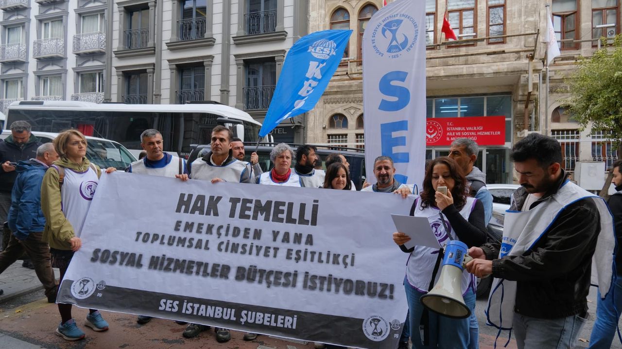 Sağlık ve Sosyal Hizmet Emekçileri Sendikası (SES) İstanbul Şubeleri, Aile ve Sosyal Hizmetler Bakanlığı'nın 2026 yılı bütçesine ilişkin taleplerini dile getirmek için İstanbul Aile ve Sosyal Hizmetler İl Müdürlüğü önünde basın açıklaması düzenledi. Ortak açıklamayı SES Anadolu Şube Eşbaşkanı Hatice Yayla okudu.