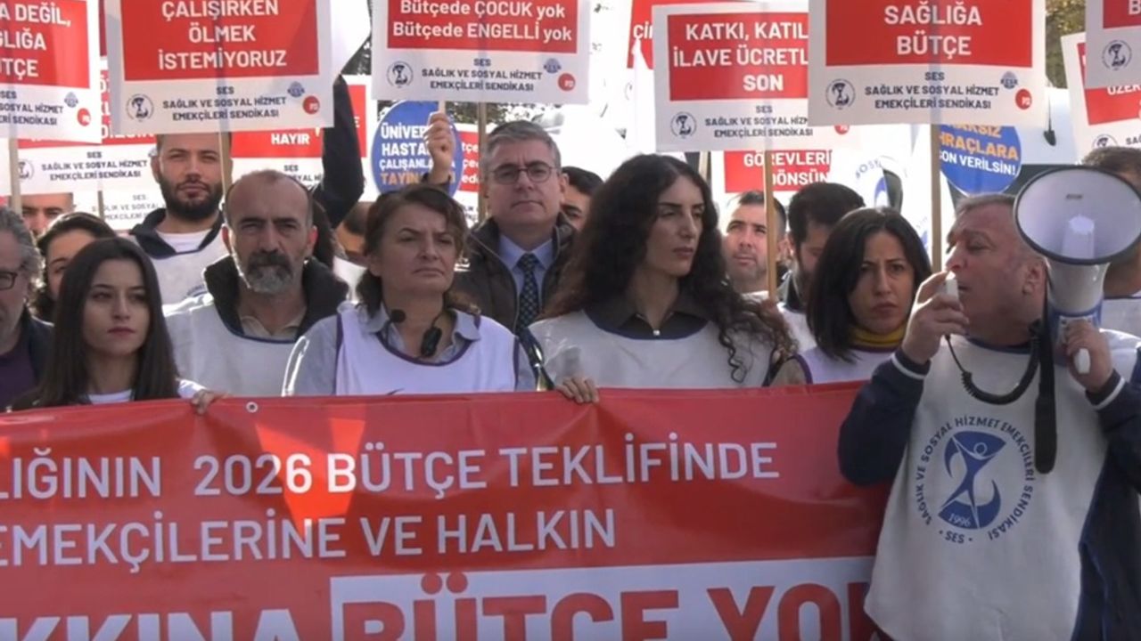 KESK'e bağlı SES üyeleri, yarın Plan ve Bütçe Komisyonu'nda görüşülecek Sağlık Bakanlığı'nın 2026 bütçesine karşı TBMM Dikmen Kapısı önünde açıklama yaptı. Açıklamaya DEM Parti Ağrı Milletvekili Heval Bozdağ ve Türk Tabipleri Birliği (TTB) Merkez Konseyi Başkanı Hilmi Önder Akay da destek verdi.