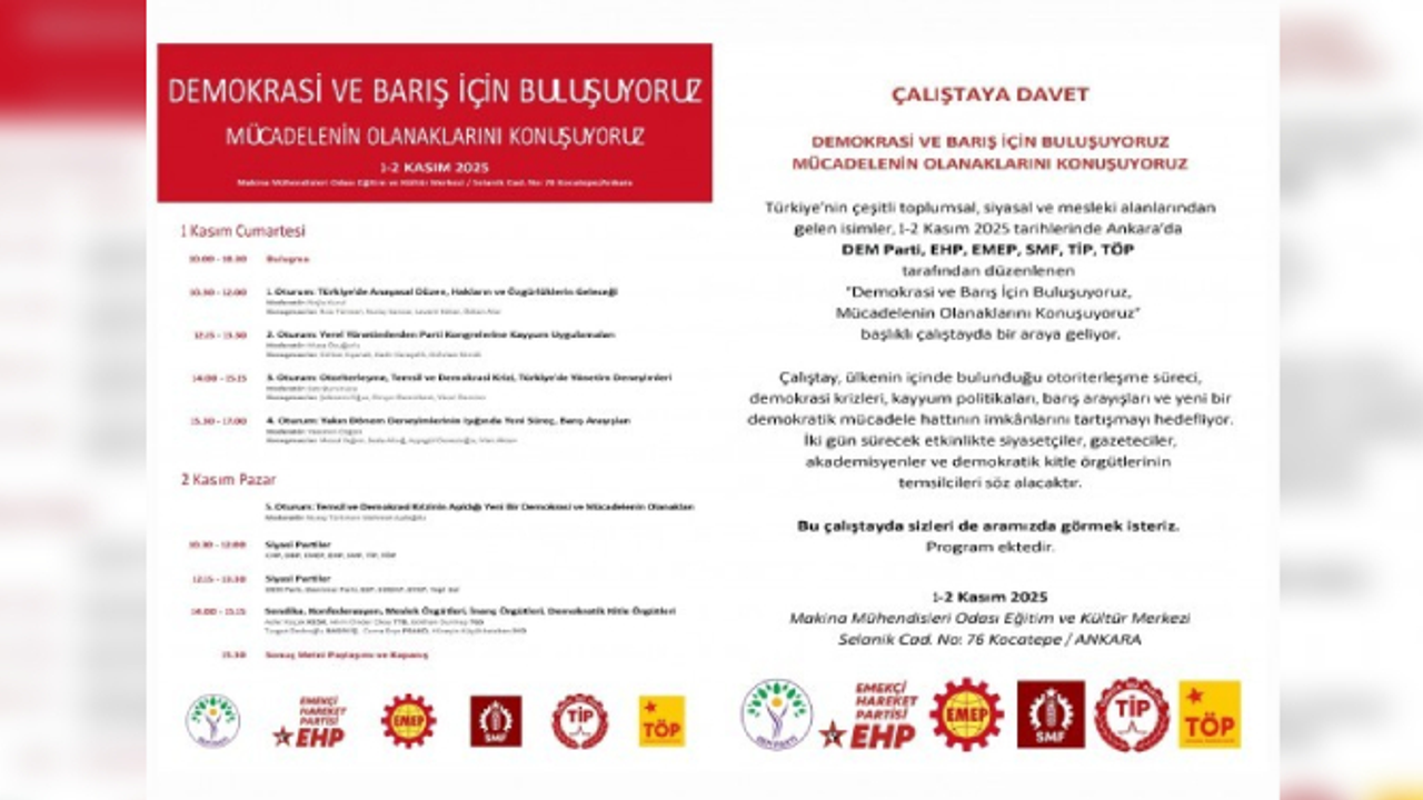 Altı sosyalist parti ve örgüt, "Demokrasi ve barış için buluşuyoruz, mücadelenin olanaklarını konuşuyoruz" temasıyla 1-2 Kasım tarihlerinde iki günlük bir çalıştay düzenleyecek.