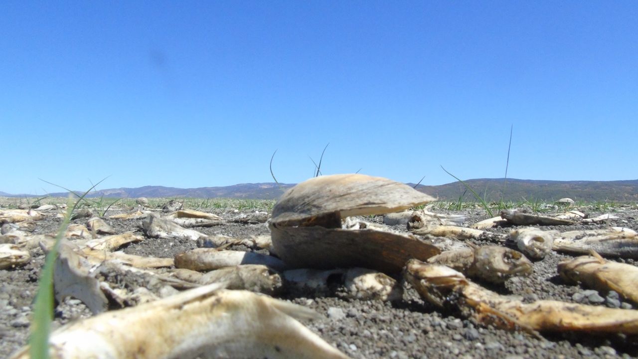 Kuraklığın etkisinin belirgin şekilde görüldüğü barajda, ölen balık ve midyeler de kuruyan toprakların üzerinde göze çarpıyor.