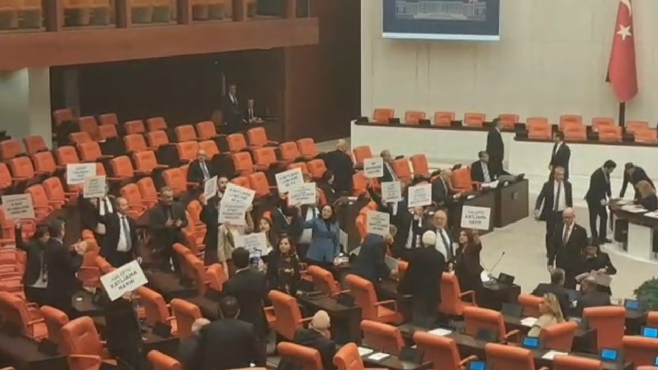 Halkların Eşitlik ve Demokrasi Partisi (DEM Parti) milletvekilleri, Suriye'nin Halep kentinde yaşanan çatışmaları ve sivil ölümlerini Türkiye Büyük Millet Meclisi (TBMM) Genel Kurulu'nda protesto etti. TBMM Başkanvekili Tekin Bingöl başkanlığında toplanan Genel Kurul'da, birleşimin açılmasının ardından DEM Partili milletvekilleri oturdukları sıralara "Halep'te katliama hayır" yazılı dövizler yerleştirdi.