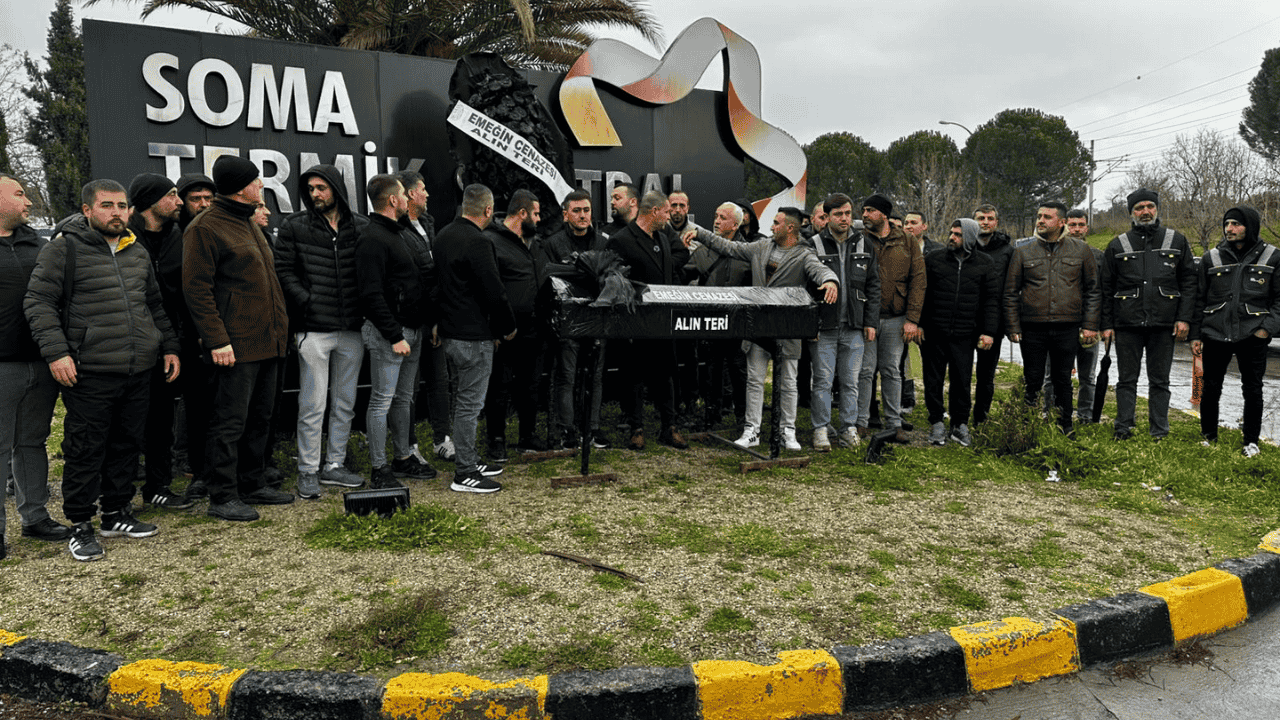 Manisa Soma Termik Santrali'nde örgütlü bulunan TES-İŞ Sendikası, toplu iş sözleşmesinden doğan geçmişe dönük maaş farklarının tek seferde ödenmemesine karşı santral önünde dikkat çeken bir eylem gerçekleştirdi. İşverenin yasal zorunluluğa rağmen ücret farklarını üç taksitte ödeme isteğine tepki gösteren sendika üyeleri, alana siyah tabut ve siyah çelenk bıraktı.