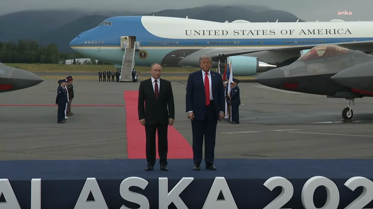 Kırmızı halı yürüyüşünün ardından iki lider, üzerinde “ALASKA 2025” yazılı platformda poz verdi. Arkadaki, pistte konuşlandırılmış iki adet F-22 Raptor savaş uçağı ile ABD başkanlık uçağı Air Force One yer aldı.