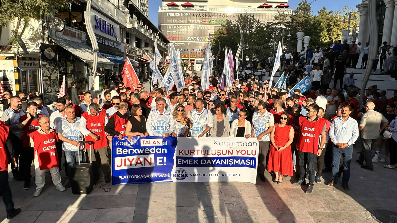 Van Büyükşehir Belediyesi'nden çıkarılan 223 işçinin protestoları sürüyor. Sanat Sokağında düzenlenen protestoya, görevden alınarak yerlerine kayyum atanan Van Büyükşehir Belediye Eş Başkanları Abdullah Zeydan ve Neslihan Şedal, KESK genel başkanı Ahmet Karagöz, CHP il örgütü, DEM Parti Van Milletvekili Mahmut Dindar, DEM Parti Van İl Eş Başkanı Veysi Dilekçi ve Gülşen Kurt, DBP İl Eş Başkanı Gönül Uzunay ve Cemal Demir ile çok sayıda yurttaş katıldı.