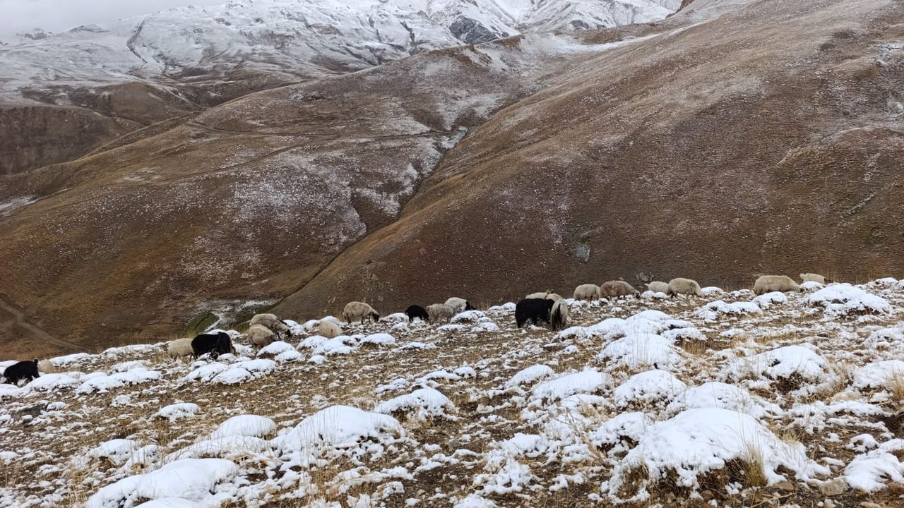 Yaylada koyunlarını otlatan bazı çiftçiler, sabah kar manzarasıyla karşılaştı.